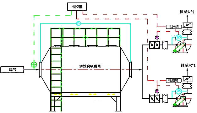 活性炭吸附設(shè)備主要由活性炭吸附器(孔板、活性炭吸附層) 、離心風(fēng)機(jī)、電控箱、風(fēng)道、排氣筒等部件組成。